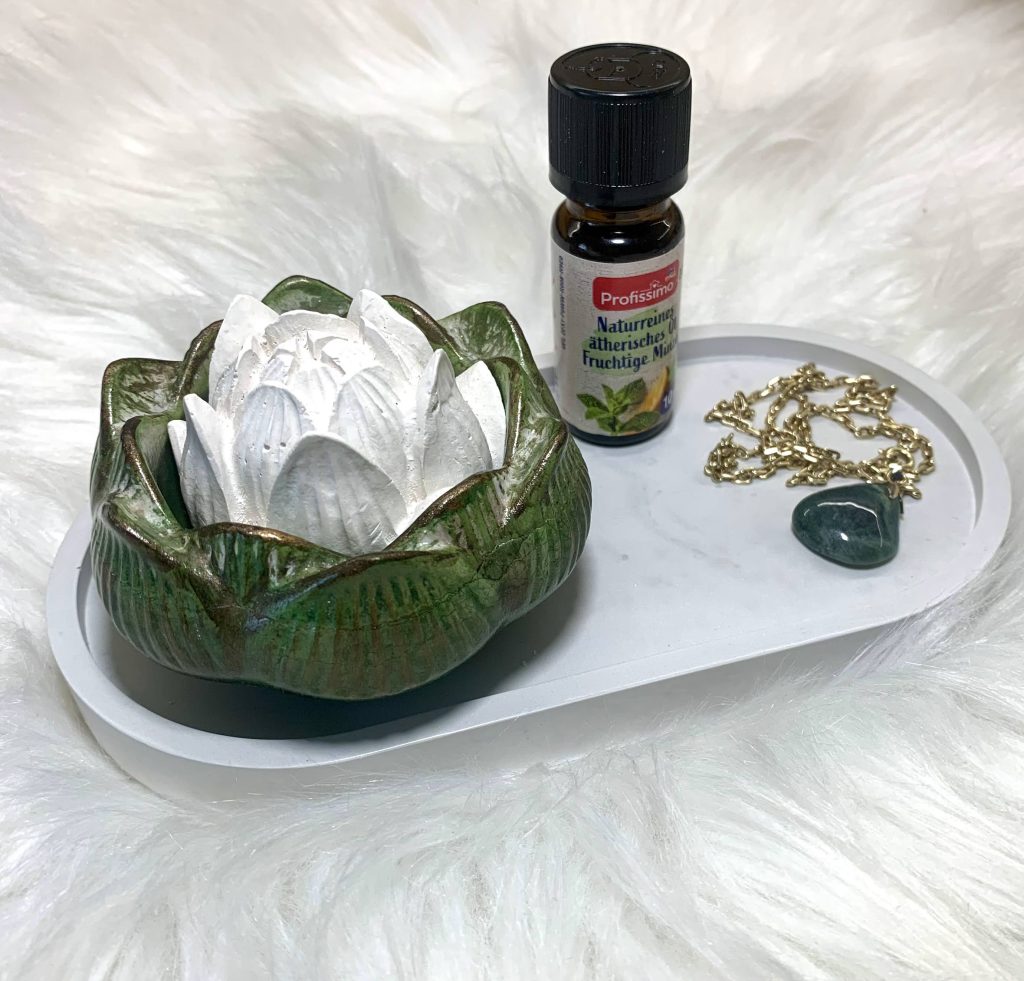 Ručne odlievaný difuzér v tvare lotosu z prírodného materiálu je dekoráciou aj nástrojom na vytvorenie vône a pohody . Sadrový kvet jemne a postupne uvoľňuje vôňu – stačí pridať pár kvapiek obľúbenej vône a domov sa naplní harmóniou, pokojom a pozitívnou energiou. Večer upokojí zmysly pred spánkom, ráno prinesie kvapku radosti či sviežosti a po práci vytvorí osobný moment pohody s dotykom aróma terapie.