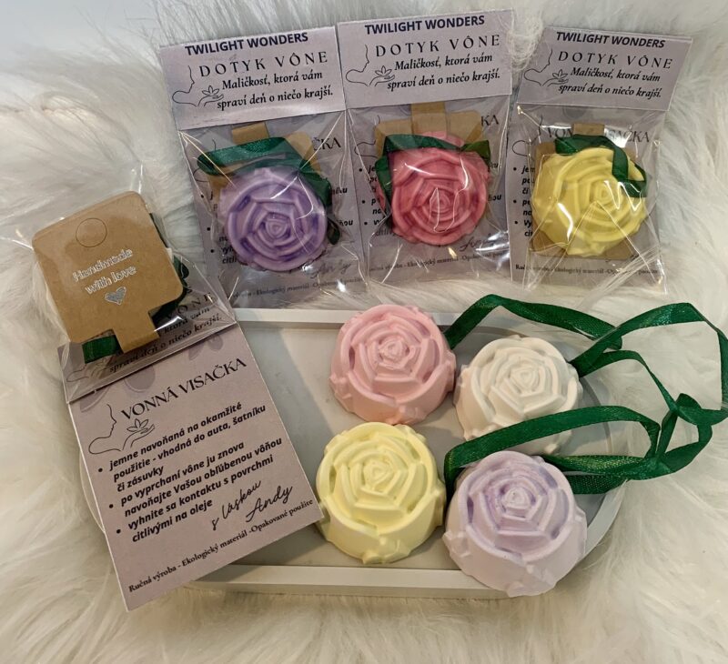 Závesná vôňa v tvare ruže je ručne odliata z prírodného, porézneho materiálu, ktorý jemne uvoľňuje vôňu do priestoru.